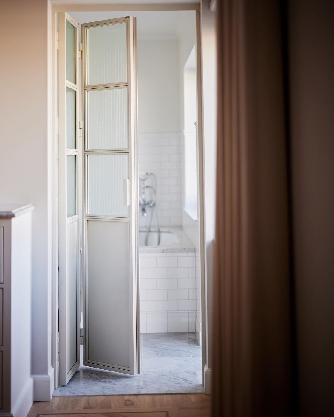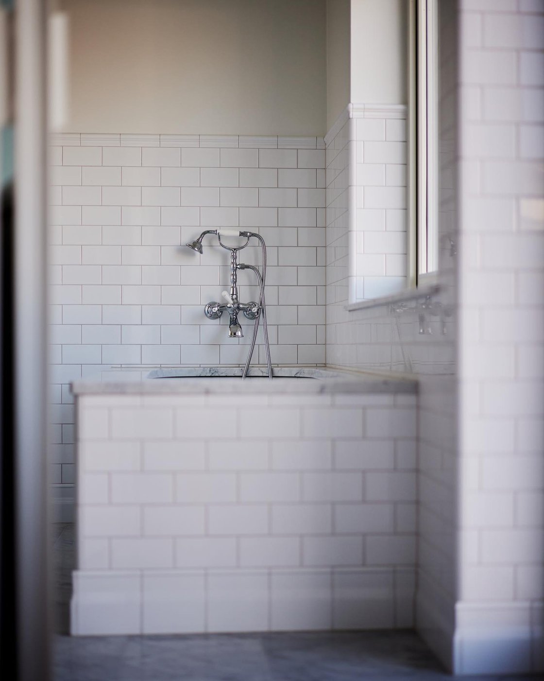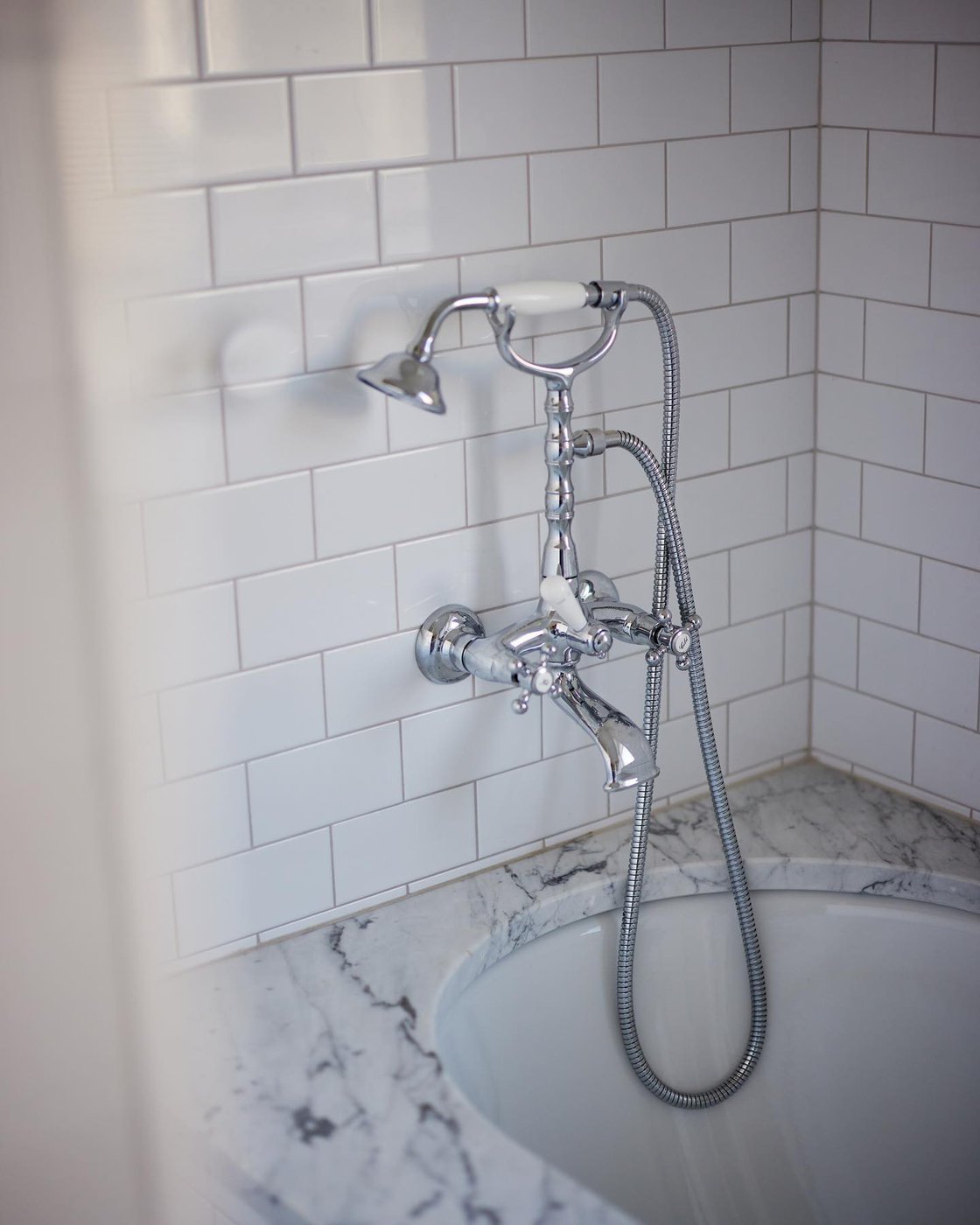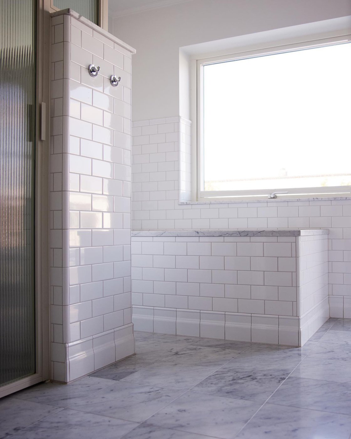 Visste ni att vi även gör renoveringar åt privatpersoner? I en villa i Hovås har vi skapat ett tidlöst och klassiskt badrum med många fina detaljer. Det klassiskt vita kakelplattorna i tegelsättning bryts vackert av på väggen och klär in både badkar och dusch. Marmorgolvet, duschväggarna i linjeglas och detaljer inspirerade från sekelskiftet i krom ger en lyxig känsla på badrummet.