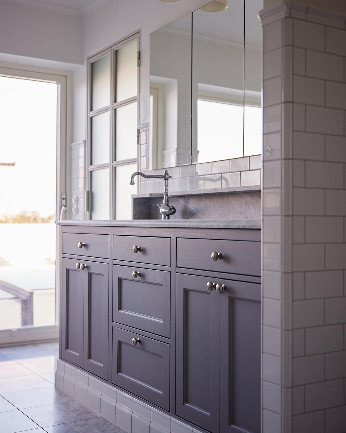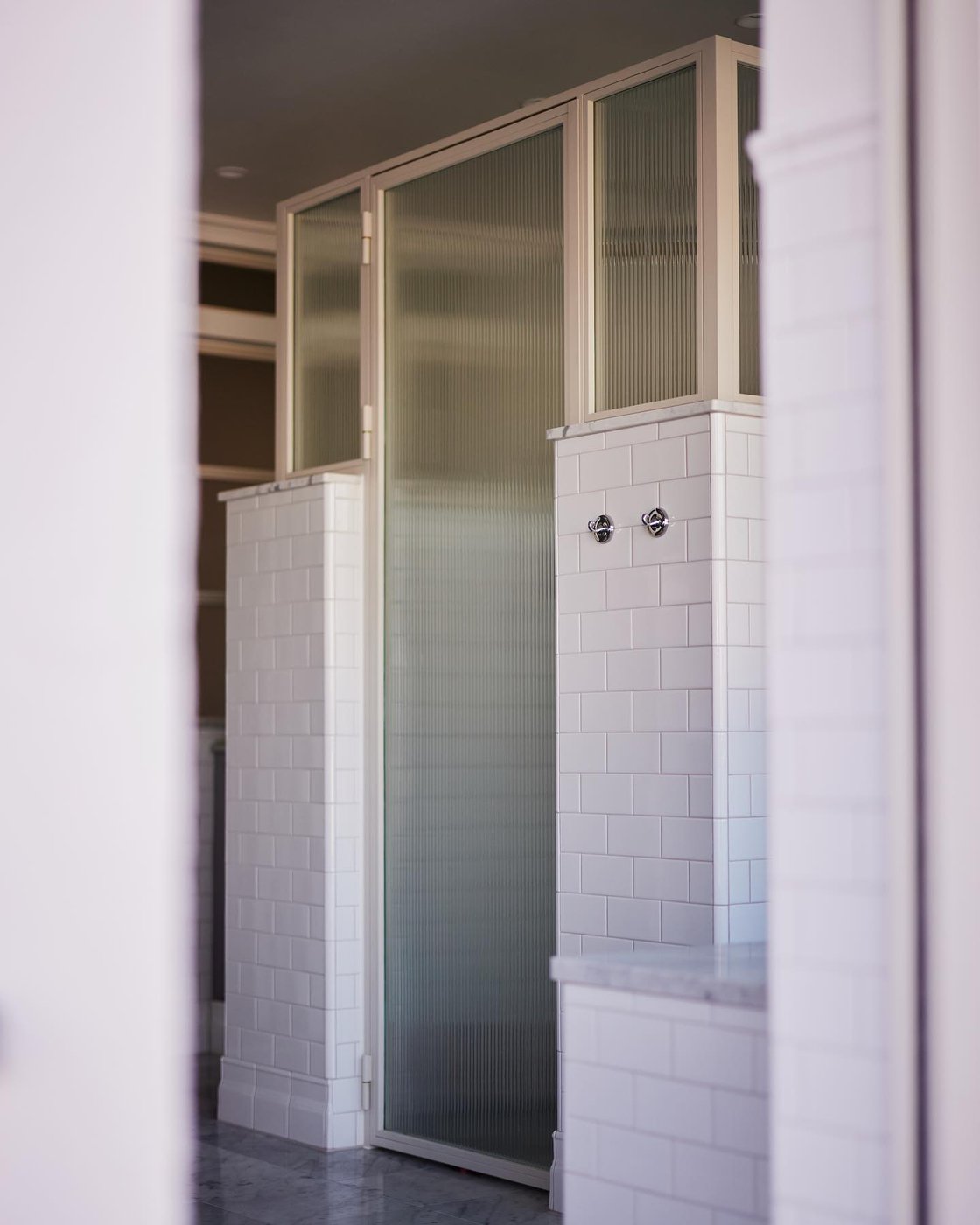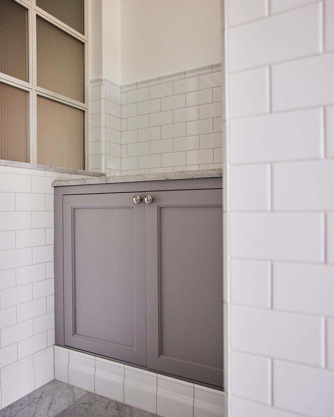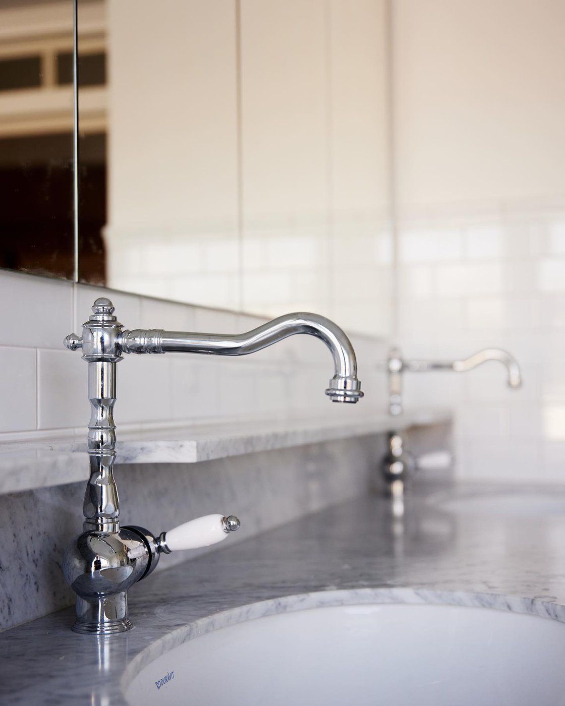 Visste ni att vi även gör renoveringar åt privatpersoner? I en villa i Hovås har vi skapat ett tidlöst och klassiskt badrum med många fina detaljer. Det klassiskt vita kakelplattorna i tegelsättning bryts vackert av på väggen och klär in både badkar och dusch. Marmorgolvet, duschväggarna i linjeglas och detaljer inspirerade från sekelskiftet i krom ger en lyxig känsla på badrummet.