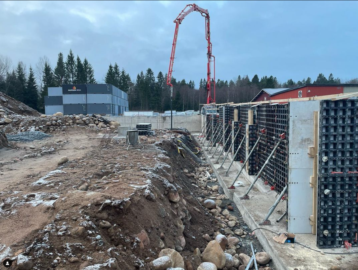 Holgers Stugmaterial är i full fart med grunden till sin nya stora virkeshall. Idag gjuter vi de sista väggarna och det börjar dra ihop sig för stommontage, givetvis i massivt trä 🪵